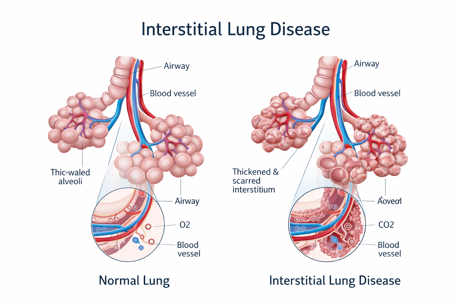 ILD includes a wide range of lung disorders that affect the interstitium, the tissue surrounding the air sacs of the lungs. Over time, this tissue can become thickened or scarred, making it harder for oxygen to pass into the bloodstream.